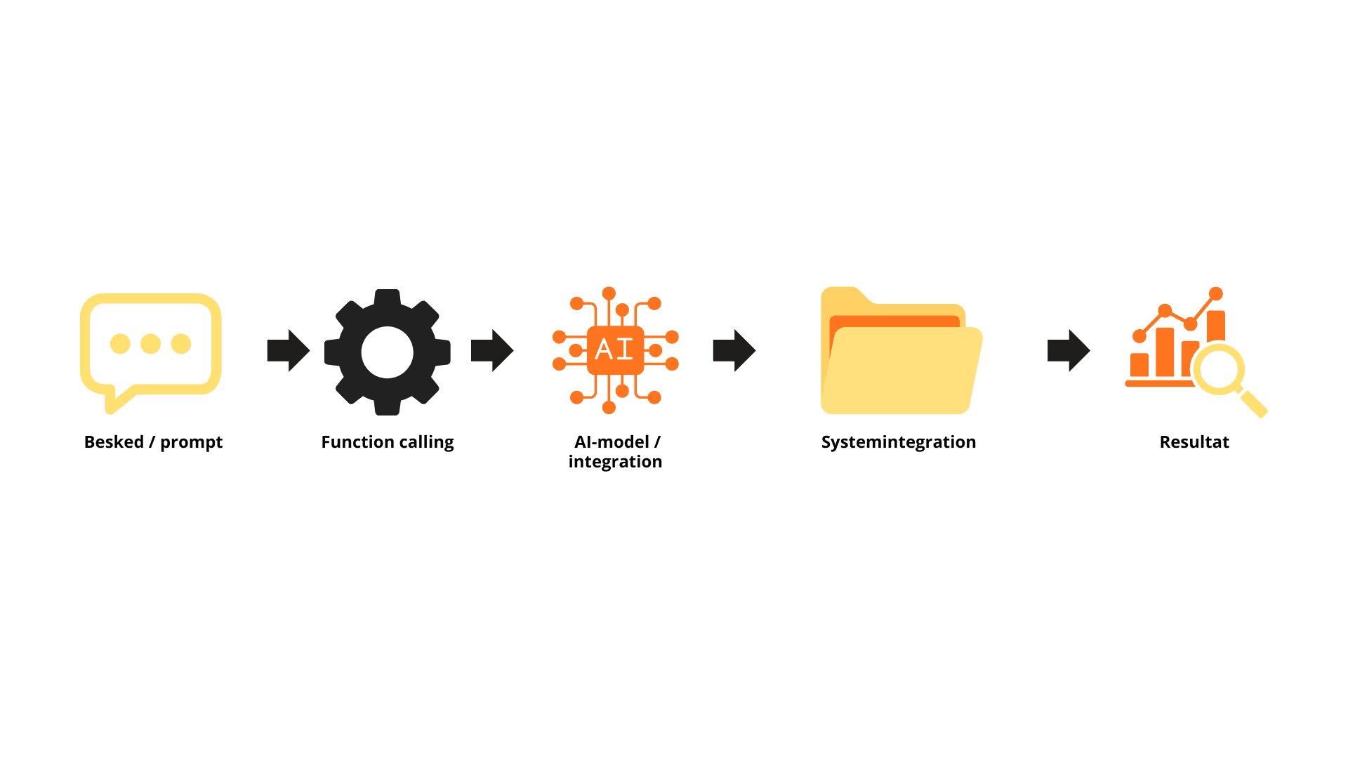 💡 Teknisk set kombinerer en AI-agent en sproglig model (LLM) med funktionel logik, ofte kaldet function calling. Det gør, at AI’en ikke bare kan forklare noget, men kan udføre reelle handlinger via API’er.