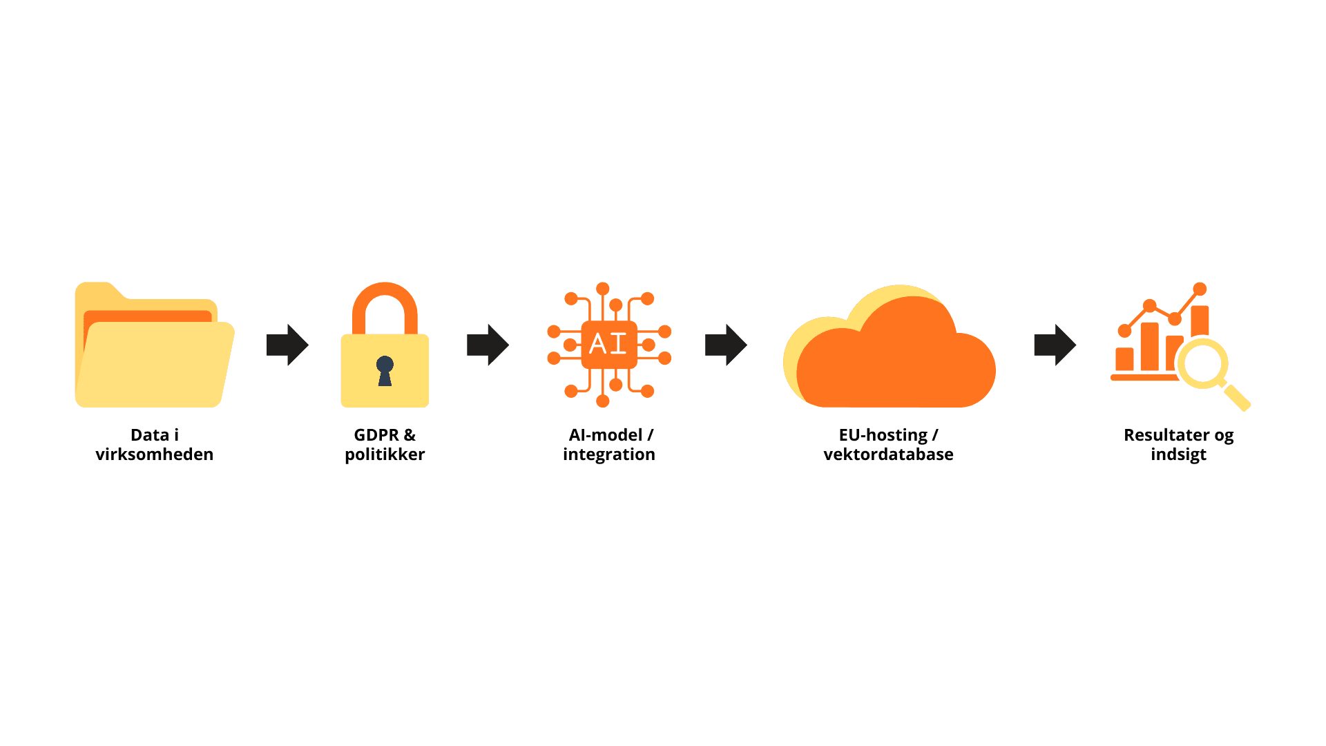 💡 Teknisk note: AI-tjenester som OpenAI og Microsoft hostes typisk i USA, men EU-hosting via Azure er på vej. Hvis dataplacering er vigtig for jer, kan en EU-baseret RAG-løsning (Retrieval Augmented Generation) være et sikrere alternativ.