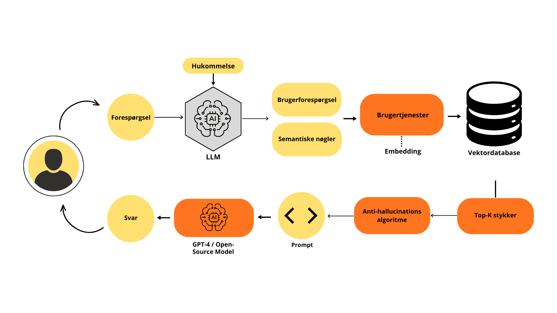 RAG (Retrieval-Augmented Generation) forbinder jeres egne data med AI. Det betyder, at I får præcise svar, der bygger på jeres virksomheds viden – ikke gæt fra nettet.